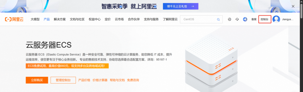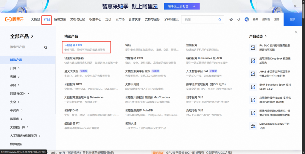 选择 “产品” -> “云服务器ECS”