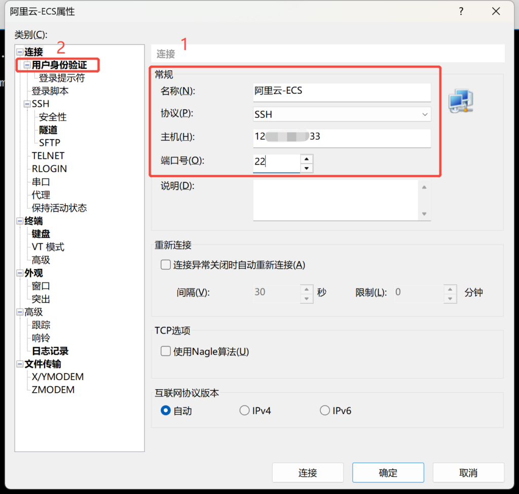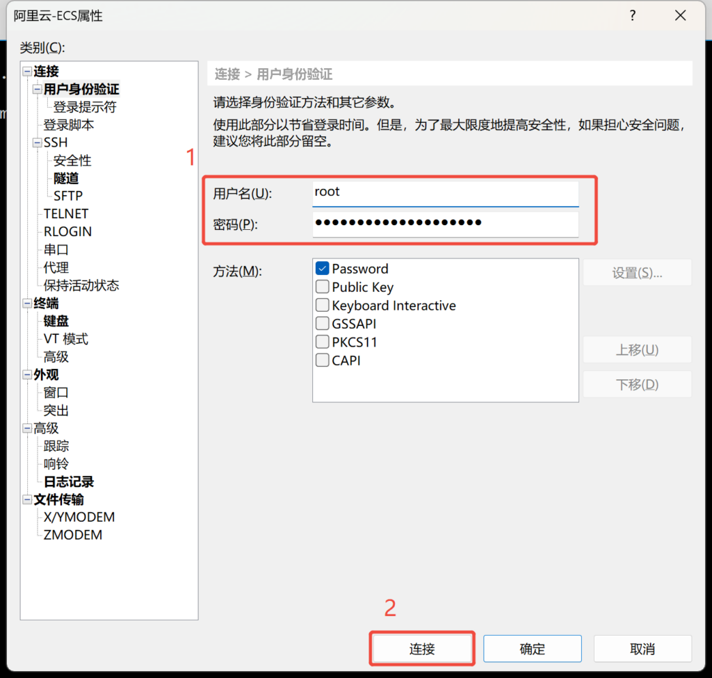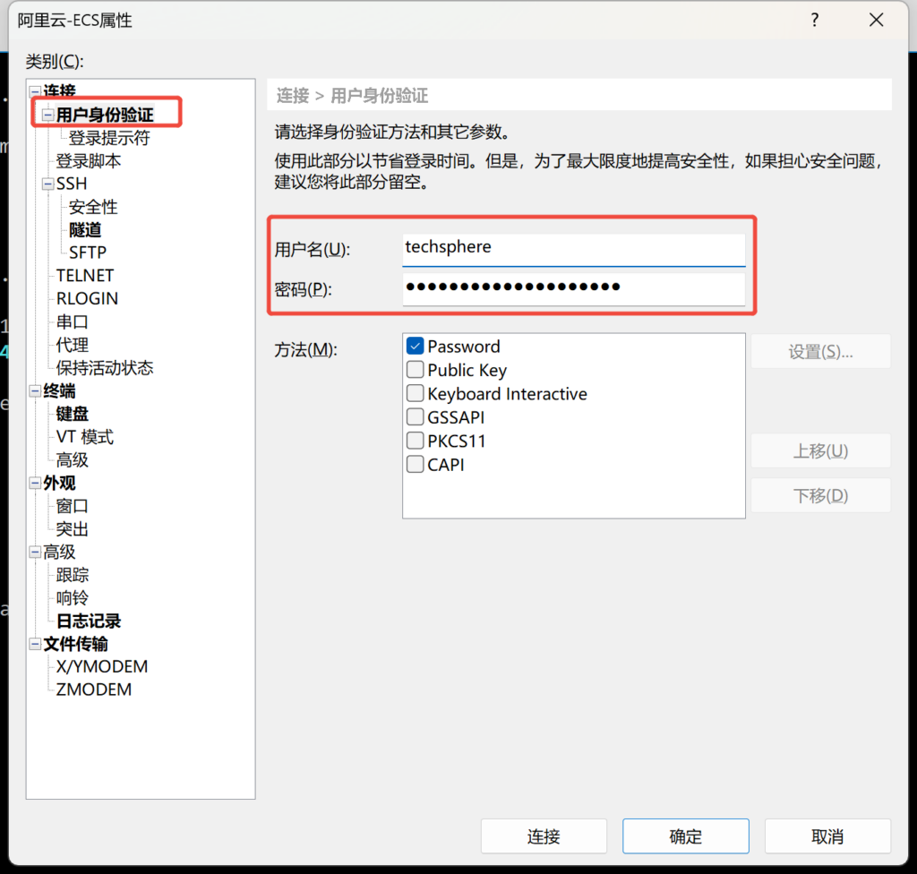 填完这些信息后,选择 “用户身份验证” ,填写用户名和密码就可以远程连接服务器啦~