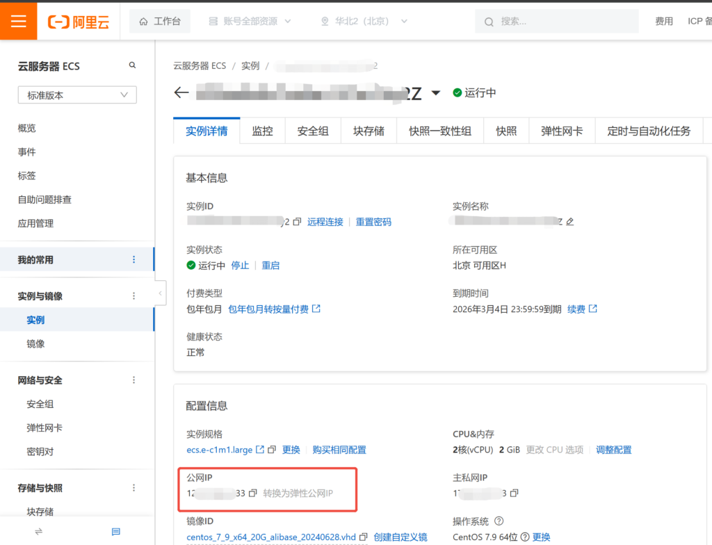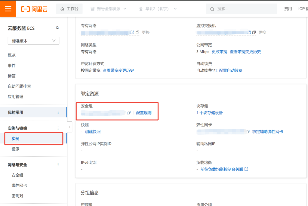 记得切换地域(购买服务器选择的地域),依次点击”实例” -> 选择你的实例ID