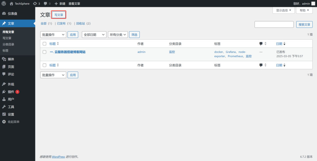在左侧菜单栏单击”文章“,并在”文章”页面单击”写文章”,开始编写你的第一篇博客