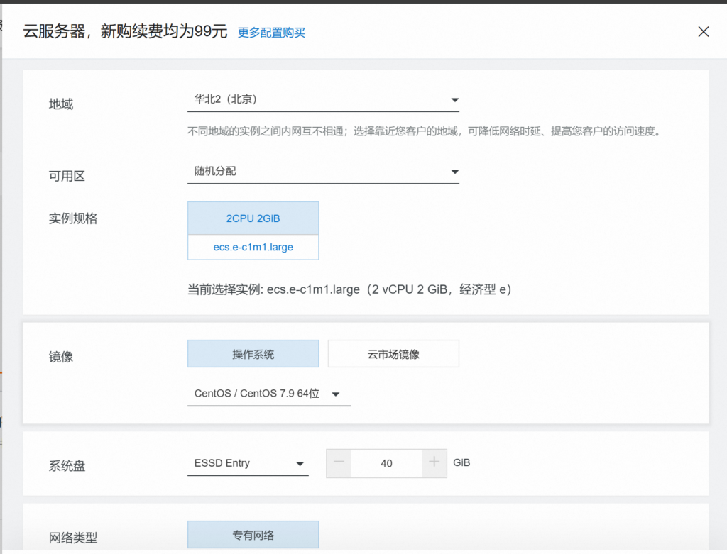 我这里选择的是阿里云的服务器,因为阿里云有一个优惠套餐,99元即可购买一台为期一年的云服务器,作为个人学习还是非常实惠的。