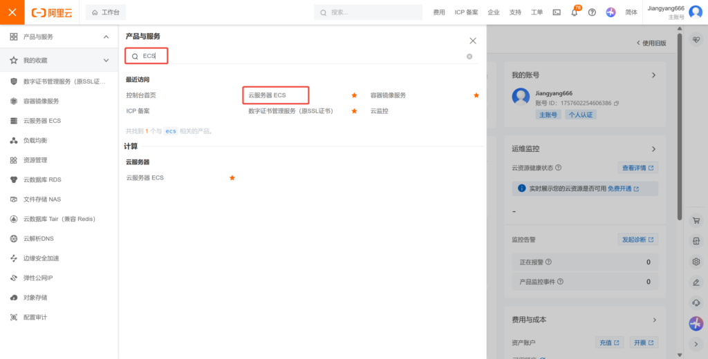 购买完成后,可在控制台搜索ECS跳转到”云服务器ECS”管理界面